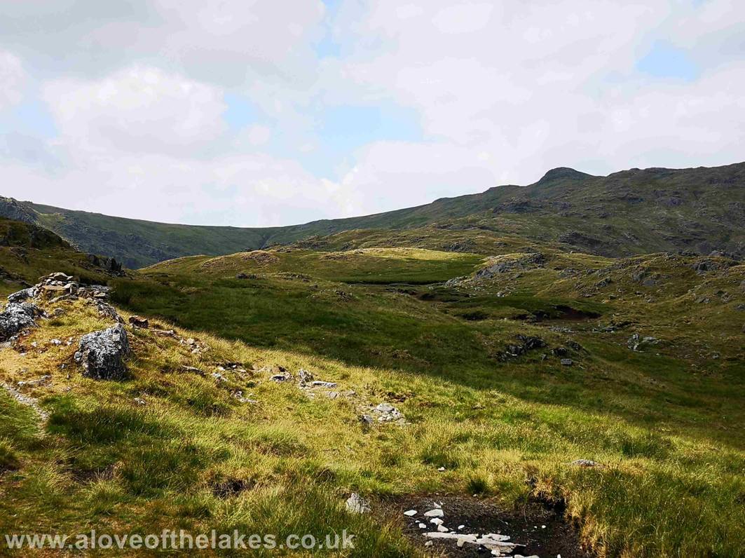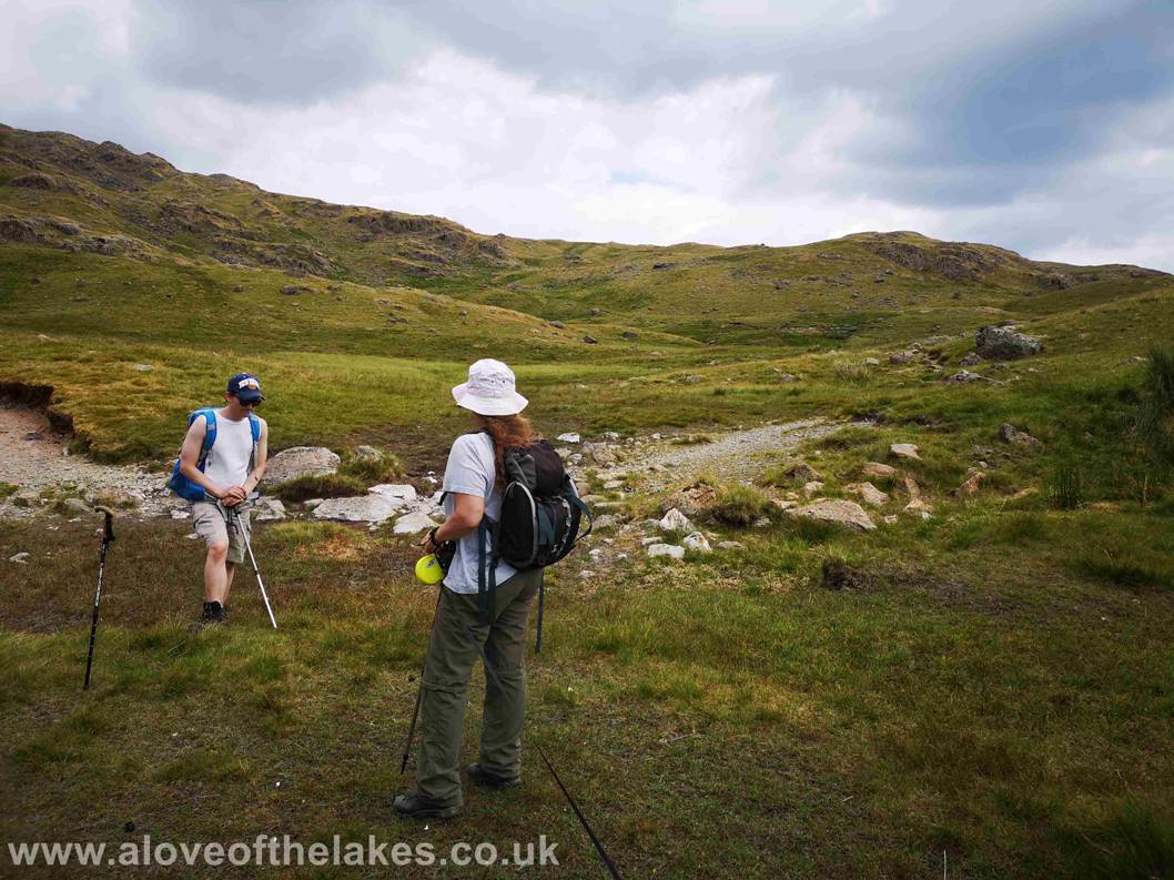The re-entrant path back to Stickle Tarn still a blazing hot sun beating