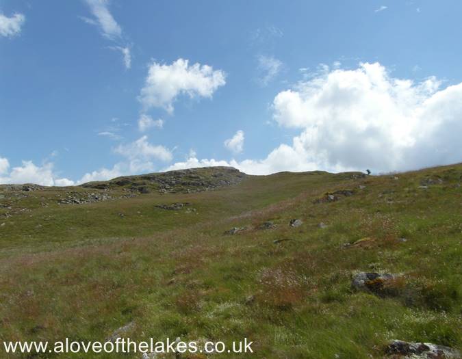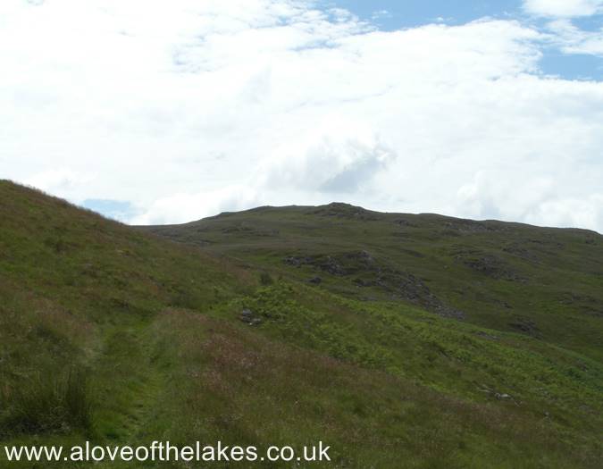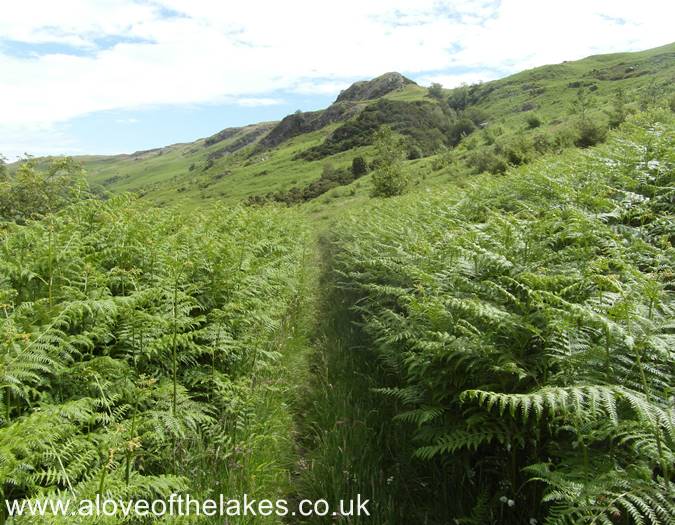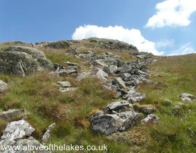 The path leads upwards again past a belt of crags which can be avoided by keeping right